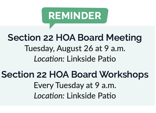 Each Section 22 Board of Director has insight into what is going on throughout the community by attending weekly workshops. There are discussions on various issues, and projects currently being dealt with. Decisions are based on need, legal aspects, by-laws and what is best for the community now and in the future. There are times when a consultation with an attorney is necessary.