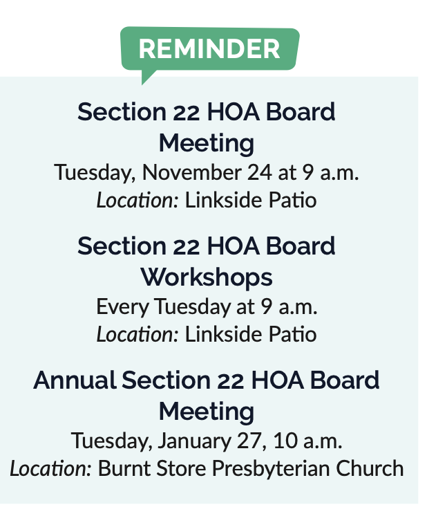 Throughout my life, I have adhered to the principle that one should speak only when they have something of value to contribute; it is wiser to remain silent, and be thought a fool than to speak and remove all doubt. While saying little would make for a brief article, it is important to honor the trust you have placed in me as your Section 22 HOA Board member, following my election in January of this year, by providing thoughts on what I have learned in the last 9 months.