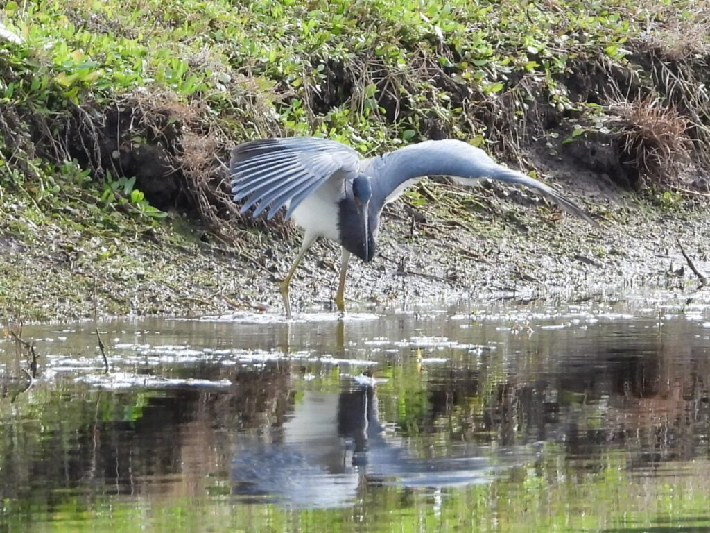 It has several hunting techniques that make it unique. It will fly over shallow water, dragging its feet to disturb underwater prey. Sometimes it will spread its wings over water to “canopy-feed”; that blocks light and scares prey. Sometimes it will strike at prey in the water while in flight.