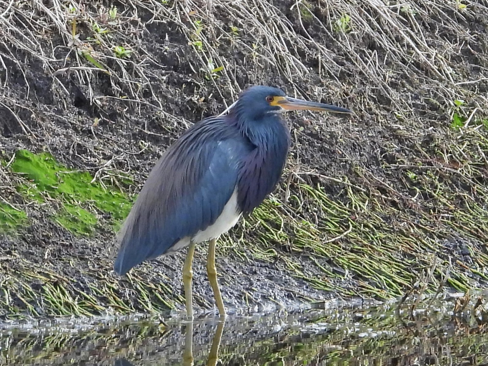 The Tricolored Heron is mostly blue, with a white belly and a brownish back. Sometimes the white extends up the underside of its throat. At 26” the Tricolored Heron is slightly longer than the more common Little Blue Heron.