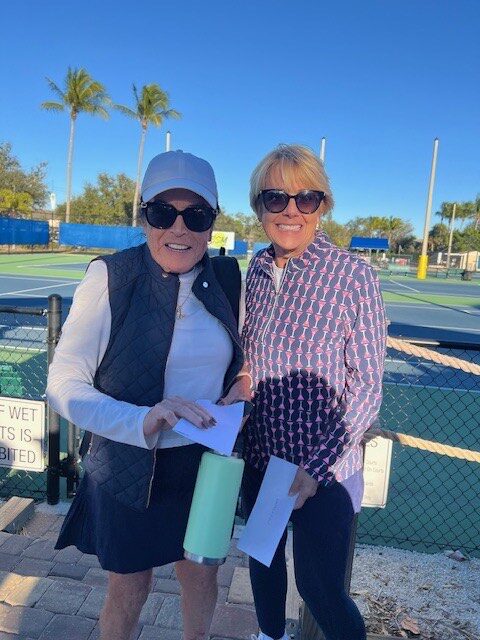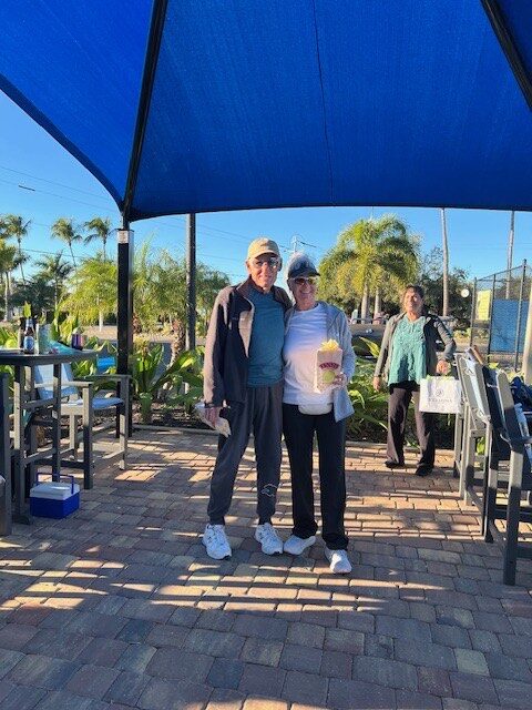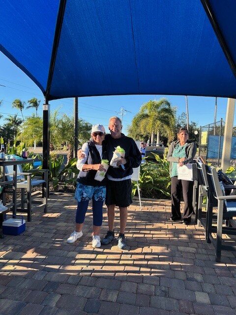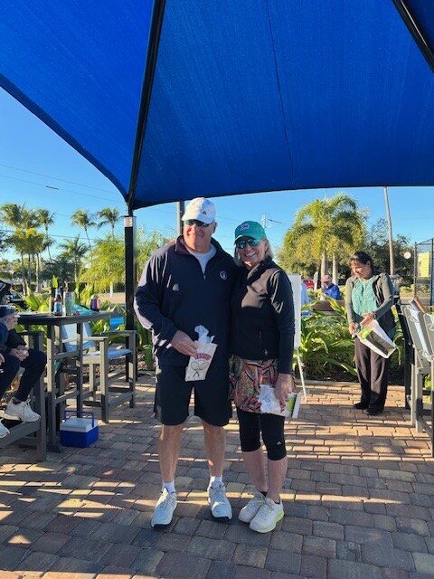 • BSM Tennis players had lots of fun at their January Tennis Tourney and Social, on a chilly, breezy day. The social event was hosted by the BSM Men’s Gold tennis team and the BSM Tennis Subcommittee. The Gold team grilled delicious burgers and hot dogs, and the tennis subcommittee organized the tournament and provided the side dishes and dessert. The winners received gift cards for Wrigley’s Tennis in Punta Gorda. The tournament was divided into two championship divisions and two consolation divisions. Winners of the two divisions were Tom Siebert & Linda Rousseau and Jerry Kopp & Jane Sitzes. Winners of the consolation divisions were Bill Bailey & Annette Norris and Judy Johnson & Dorothy Schroeder. Kelly Millar is shown by the dry-erase board with the line-up.