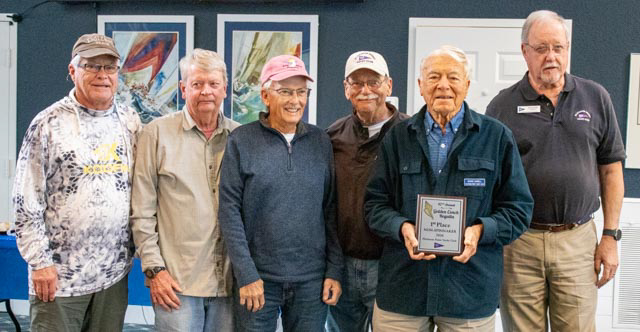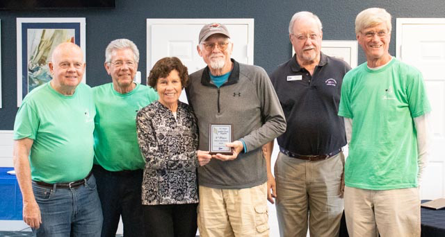 A dinner banquet was held on Saturday evening with over 120 attendees with an awards ceremony for the Harbor 20s. Winning the Harbor 20 fleet in first place was Jeff Scholtz on Yellow Jacket from West Palm Beach, followed by Rob Sisk on Aude, Man and the Sea and in third, Jay Nadelson on All Clear, both from Punta Gorda. Representing PPYC was Graham Segger and crew Mark Gabel on Spirit, pictured below.