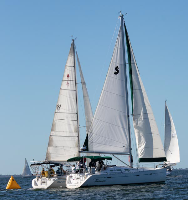 Picture perfect morning, a slight breeze on Charlotte Harbor, 29 crewed sailboats, and a cast of experienced support, in various watercraft – waiting for the action to begin!